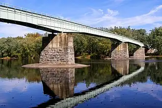 A vehicular bridge had been located at the site of the present bridge since 1869. The original structure was a four-span timber bridge with wooden arches which was covered by a wooden shed with a slate roof. It was a private toll bridge until 1927.[2]