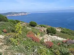 Species found in the garrigue include marine cistus (Cistus monspeliensis), rosemary (Rosmarinus officinalis), betonya fetida (Stachys glutinosa), Corsican broom (Genista Corsica), thyme (Thymus spp.) timelea (Thymelaea tartonraira) and helichrysum (Helicrisum microphyllum), but thorny cornflower (Centaurea horrida), dragon lobster (Astragalus tragacantha), Balearic euphorbia (Euphorbia pithyusa) and nymphaeus statice (Limonium nymphaeus) are also found there. Along the coast vegetate the small shrubs of Terracciano's astragalus (Astragalus terraccianoi), Sardinian broom (Genista sardoa) and thorny witchgrass (Stachys glutinosa), associated with herbaceous species such as sea lily (Pancratium illyricum), silene nodulosa (Silene nodulosa), Corsican geranium (Erodium corsicum), Bocconi fennel (Seseli bocconi), Schmid's curd (Valium schmidii), spatulate daisy (Bellium bellidioides), pauciflorous garlic (Allium parciflorum), Requien's saffron (Romulea requienii), lesser saffron (Crocus minimus), gigarum (Arum pictum), asphodel (Asphodelus microcarpus), and nettle verdescura (Urtica atrovirens).
