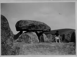 The capstone is the lesser half of a granite slab brought to Denmark from Northern Scandinavia by ice age glaciers' movements. The underside is remarkably flat, and possibly split from another half, by the dolmen builders. The other half is a 19-tonne (21-ton) slab 2 km (1.2 mi) to the northwest, placed as a capstone on another dolmen, Agri Dyssen.[1] How these slabs were transported and erected by Stone Age people is not known.