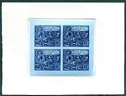In addition, a separate printing in blue was made at an exhibition of old printing techniques at the London Guildhall Art Gallery by Enschede, also in blocks of four. Fifty imperforate blocks were printed on roughly torn paper which were sold to the public.[8][9]