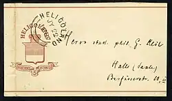 On 13 February 1878 three different newspaper wrappers, with a design incorporating the arms of Heligoland, were issued, a 2 farthings/ 3 pfennige in green, 3 farthings/5 pfennige in brown and a 1½ pence /10 pfennige in blue.[1] The 2 farthings/ 3 pfennige wrapper is the only wrapper known to have been reprinted in the original colour as well as black, gold, rose and yellow in addition to being printed on yellow paper.[2] A supply of 3 farthings/5 pfennige wrappers on rose tinted paper arrived after Heligoland was handed over to Germany and thus were not used for postal purposes.[2] Forgeries exist of all three wrappers.