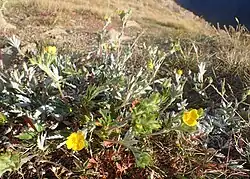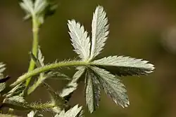 Potentilla pulcherrima (syn. Potentilla gracilis var. pulcherrima), the beautiful cinquefoil, soft cinquefoil, or whiteleaf cinquefoil, is a species of flowering plant in the family Rosaceae.[2][3] It is native to Canada, and the north and west-central United States, with a disjunct population in Connecticut.[1] Noted for the shiny abaxial surfaces of its leaves, it is a perennial shrub reaching 30 in (76 cm) with yellow flowers.[2]