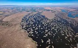 The area features several lakes (typically 30-70 yards wide and 10–30 feet deep). These lakes, known as "potholes" were created through both natural and man made processes. The potholes were initially carved out during the Pleistocene by flood waters originating from Glacial Lake Missoula.[3] Subsequent damming of the area by the Columbia Basin Project raised the water table high enough to allow these topographical depressions to become lakes. The formation of the pothole lakes also allowed the creation of thousands of micro-islands as the lakes wrap around the dunes, forming islands. They are home to willow trees and cattails due to their boggy-like state.