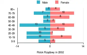 (by sex in 2002)TOTAL Males Females I. TOTAL person 110 58 52 — of which in % 100 52.7 47.3 1. BY AGE GROUP A. At pre-working age person 22 13 9 — of which in % 20 11.8 8.2 B. At working age. grand total person 56 35 21 — of which in % 50.9 31.8 19.1 a. at mobile working age person 36 20 16 — of which in % 32.7 18.2 14.5 b. at non-mobile working age person 20 15 5 — of which in % 18.2 13.6 4.6 C. At post-working age person 32 10 22 — of which in % 29.1 9.1 20
