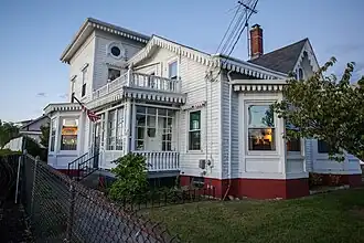 The house is a timber-frame house that was originally constructed on the west side of Pine Street, but its original form is not known for sure due to the extent of its expansion and remodeling. The NRHP nomination states that it could have been a 1+1⁄2-story gabled roof cottage with a cross-gable in the center, a style popular during the mid-century in Pawtucket. This original structure retains little of its form except for the Gothic hood moulds on the second floor end windows and the Gothic bargeboards. A two-story hipped roof addition was constructed in two phases, one completed before 1877 and the other between 1895 and 1902. Though the NRHP also states that the original house was enlarged in the late 1860s or 1870s without specification to the work done at the time. The additions include a bay window on the facade and openwork on the porch sides. The later alterations to the building worked to complement the distinctive bargeboards of the cottage with the work on the eaves and window heads of the addition.[3]