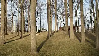 In 1847, this site became the cemetery for early residents of Ash Township, which was established in 1837. The site was located on the property line between the Potter and Flint homesteads near Swan Creek. In 1860, the families deeded the 1.0-acre (0.4 ha) cemetery to the Swan Creek Cemetery Company, and the cemetery was also known as Swan Creek Cemetery. There was no direct roadway leading to the cemetery, but a farmer's lane allowed easy access. The cemetery remained active until its last known burial in 1930. By then, there were over 80 graves, some of which belonged to the township's earliest settlers, five Masonic lodge members, and six Civil War veterans.[1][2]