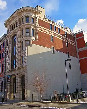 The three-bay Beaux Arts facade begins at the top with masks on the cornice and molded egg-and-dart rear modillion blocks. It gives way to a leafy swag motif above the molded frieze. Similar patterns continue down the stories, joined by quoined pilasters. The ground level is totally quoined and projects, with an intricate wrought-iron gate on the main door and decorative Doric columns. On the sides, a red-and-yellow brick diamond pattern runs from front to rear at the fifth story.[1]
