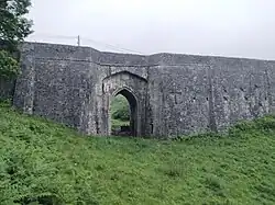 Both Pollaphuca Bridge and a second bridge, crossing a dry gorge 150m to the southwest, were designed by Alexander Nimmo in Gothic style and built between 1822 and 1827 for a total cost of £4,704. Poulaphouca Bridge replaced Horsepass Bridge to the northeast, now under Poulaphouca Reservoir.[5][6][7][8][9][10] Wright's Guide to the County of Wicklow describes the bridge and waterfall in 1827: