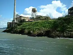 The Power House is an electrical supply building on the northwest coast of Alcatraz Island, off the coast of San Francisco, USA. It was constructed in 1939 for $186,000 as part of a $1.1 million modernization scheme which also included the water tower, New Industries Building, officers quarters and remodeling of the D-block.[1] The white powerhouse smokestack and lighthouse were said to give an "appearance of a ship's mast on either side of the island."[2] A "Warning. Keep Off. Only Government permitted within 200 yards" sign lay in front of the powerhouse to deter people landing on the island at the point.
