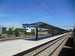 Praha-Holešovice railway station (Czech: Nádraží Praha-Holešovice) is located in Holešovice, a northern district of Prague, capital city of the Czech Republic. Opened in 1985, the station was originally used as a terminus for international fast trains coming from the east. Since the completion of the Nové spojení ("new connection") in 2010, however, these trains terminate at the more central hub, Praha hlavní nádraží. Nevertheless, international trains from hlavní nádraží running north to Dresden and Berlin, as well as northwest-bound inter-regional trains still call here. The station is adjacent to Prague Metro's Nádraží Holešovice station on line C and also to stops of the same name on lines 6, 12, and 17 of the city's tramway system, as well as a bus station.