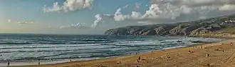 Praia do Guincho (English: Guincho Beach) is an Atlantic beach located on Portugal's Estoril coast, 5 km from the town of Cascais, and is located in the municipality of Cascais, more precisely in the parishes of Cascais e Estoril and Alcabideche, in the District of Lisbon. Guincho is situated close to several small villages, including Areia, Charneca, Figueira do Guincho and Biscaia.
