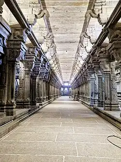 In the Hindu temple, the prakaram is the temple compound around the sanctum. Typically a Hindu temple[1] prayer hall is generally built in front of the temple's sanctum sanctorum (garbhagriha).[2] Usually large Hindu temples have one or more prakarams.[3] The Prakaram acts as circumambulatory passage to the devotees to come around the sanctum. Based on the size of the temple, there can be more than one Prakaram with the smaller one enclosed within the larger.[4] As per Hindu religious practices, devotees start to come around the outer prakarams to the inner most before entering the sanctum. This is indicative of the belief that the devotees have to lose the outermost bondage to the inner most one before attaining divinity. The method is also indicative of reduction of noises in the outer space to the inner most to increase communiion with god.[5] Ramanathaswamy Temple has outer set of corridors is reputed to be the longest in the world, measuring about 6.9 m in height, 400 feet each in the east and west and about 640 feet in the north and the south. The inner corridors are about 224 feet each in the east and the west and about 352 feet each in the north and the south.[6]