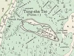 Pratas Island,[11][14]: 5 [15][16][17] also known as the Tungsha Islands[18][19][20][21][22][23] or the Dongsha Islands (Chinese: 東沙群島; pinyin: Dōngshā Qúndǎo; Pe̍h-ōe-jī: Tang-soa Kûn-tó; lit. 'East Sand Islands'[11]), is a coral island situated in the northern part of the South China Sea[1][2][3][6] administered as part of Cijin District, Kaohsiung, Taiwan, Republic of China.[24][25][26] It is located about 170 nautical miles (310 km; 200 mi) southeast of Hong Kong.[7][27] It has an area of about 240 hectares (590 acres), including 64 hectares (160 acres) of lagoon, and is the largest of the South China Sea Islands.[28] It is the location of the Dongsha Airport.