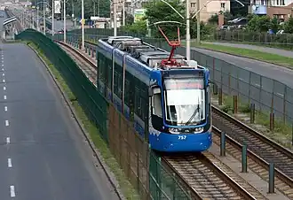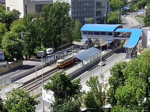 The Pravoberezhna Line or Borshchahivka Rapid Tram is the first line of the Kyiv Light Rail, located in the western part of Kyiv. Constructed from 1975 onwards, the rail corridor connects central Kyiv near Kyiv Passenger Terminal with Shuliavka and Borshchahivka, before having its terminus at the Kyiv Kiltseva Road. The 1, 2, and 3 trams run along the Pravoberezhna Line, together carrying 150,000 passengers daily.[1]