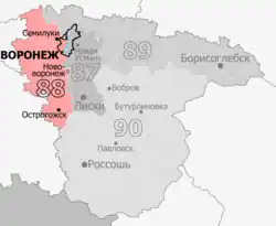 1993–2007: Khokholsky District, Nizhnedevitsky District, Ramonsky District, Repyovsky District, Semiluksky District, Voronezh (Kominternovsky, Sovetsky)[2][3][4]
