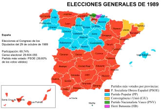 Felipe González called general elections for October 1989, where he once again won the absolute majority, but this time by only one deputy - a relative setback previously seen in the municipal elections of 1987, where the Socialists lost their majority in the big cities though keeping the municipalities of less than 50,000 inhabitants. As Santos Juliá pointed out:[58]
