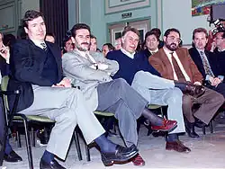The positive effects of the economic policy became evident in 1985, when the Spanish economy began a strong expansion that lasted until 1992.[46] However, speculative capital movements also flourished during those years, led by people linked to the financial world who sought quick profits and who were presented by certain conservative media as role models: Mario Conde, the "Albertos" (Alberto Cortina and Alberto Alcocer), Javier de la Rosa, etc.[47]