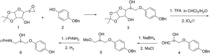 - ^ DE 2503968, Jaeggi KA, Schröter H, Ostermayer F, "Optisch aktive Derivate des 1-Phenoxy-2-hydroxy-3-aminopropan und Verfahren zu ihrer Herstellung [Optically active derivatives of 1-phenoxy-2-hydroxy-3-aminopropane and the process for their production]", published 1975-08-14, assigned to Ciba-Geigy AG Chem. Abstr. 84, 5322 (1976).