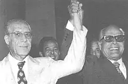 The firm stance of Bourguiba led him to acquire a strong popularity among the nationalist circles. Furthermore, the congress held by the Destour which took place on 12 and 13 May 1933 in Tunis, ended in favor of the young team of L'Action tunisienne, elected unanimously in the executive party committee.[44] This strong position among the movement permitted them to influence party decision, eager to unify all the factions among a nationalist front. In the meantime, due to the ongoing naturalist issue in Tunis, the Residence decided the suspension of every nationalist paper on 31 May, including L'Action Tunisienne but also the prohibition of Destour activity. However, the French government convinced that Manceron had acted tardily in taking expected measures, replaced him by Marcel Peyrouton on 29 July 1933. Bourguiba deprived of his freedom of speech in this repression atmosphere and trapped inside the Destour moderate policy, aspired to get his autonomy back.[45]