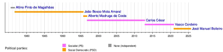 1. ^ Altino Pinto de Magalhães, former Military Governor of the Azores, served as President of the Regional Junta of the Azores, the de facto head of government following the Carnation Revolution to the taking office of Mota Amaral, the 1st President of the Regional Government of the Azores.