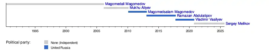 | (1) | Magomedali Magomedov (1930–2022) | 26 July 1994 | 20 February 2006 | 11 years, 209 days | Independent | |||
