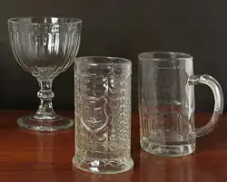 Pressed glass (or pattern glass)[1] is a form of glass made by pressing molten glass into a mold using a plunger.[2] Although hand pressed glass has existed for over 1,000 years, the use of a machine for pressing was first patented by Pittsburgh glass man John P. Bakewell in 1825 to make knobs for furniture.