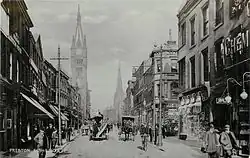 Preston was recorded in the Domesday Book of 1086 as Prestune.[9] Various other spellings occur in early documents: Prestonam (1094), Prestone (1160), Prestona (1160), Presteton (1180), and Prestun (1226). The modern spelling occurs in 1094, 1176, 1196, 1212, and 1332.[10] The town's name is derived from the Old English words Presta and tun. The tun (enclosure, farmstead, village, manor, estate)[11] of the Presta.[12]