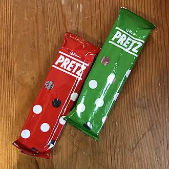 Pretz (プリッツ, Purittsu) is a Japanese snack made by Ezaki Glico.[1] Like Ezaki Glico's other popular snack, Pocky, Pretz is stick-shaped and comes with a texture similar to pretzels. Unlike Pocky, Pretz is dusted with seasonings instead of being enrobed in a flavoured fudge.[2]