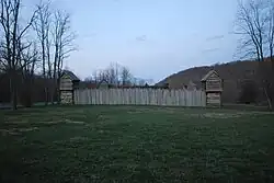 Because there was safety in numbers, the settlers built a number of refuge forts, including one on the homestead of Jacob Prickett.[5] Fairly simple in design, Prickett's Fort was little more than a hundred-foot-square log palisade built around Prickett's house. Native Americans tended to avoid such strong points, preferring to ambush small work parties.[6]