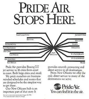 - ^ Staff writer(s) (June 25, 1985). "Pride Air Begins Flights on Aug. 1". New York Times.