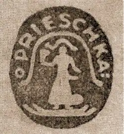 The present district of Prieschka does not have its own coat of arms. However, an old village seal has been preserved from Prieschka, which, like most of the few known village seals in the old district of Bad Liebenwerda, probably dates from the first half of the 19th century. In the center of the seal is a figure that can be interpreted as a female figure or a sower holding an object in her right hand. There is a cloud above her head. The inscription around the high oval seal contains the place name Prieschka.[33]