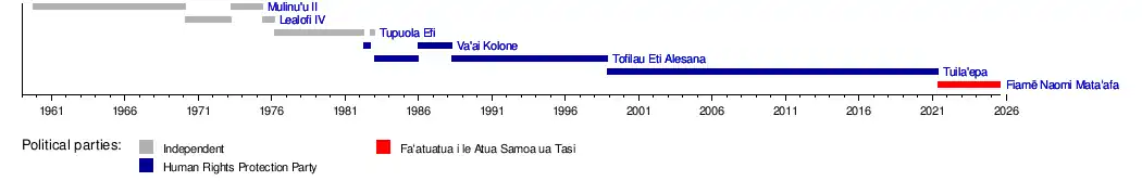 The prime minister of the Independent State of Samoa (Samoan: Palemia o le Malo Tuto’atasi o Sāmoa) is the head of government of Samoa. The prime minister is a member of the Legislative Assembly, and is appointed by the O le Ao o le Malo (Head of State) for a five-year term. Since independence in 1962, a total of seven individuals have served as prime minister. The incumbent was disputed due to the 2021 constitutional crisis, when Tuilaʻepa Saʻilele Malielegaoi refused to accept the results of the 2021 general election. On 23 July 2021, the Samoan Court of Appeal ruled that the Faʻatuatua i le Atua Samoa ua Tasi (FAST) party had been in government since 24 May.[2] Tuilaʻepa then conceded defeat, resulting in FAST party leader Fiamē Naomi Mataʻafa becoming prime minister.[3]