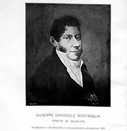 Prince Giuseppe Emauele Ventimiglia (1766-1814) was a Sicilian politician. He was a Member of the Parliament of the Kingdom of Sicily. He was instrumental along with Paolo Balsamo and his uncle Carlo Cottone prince of Castelnuovo in the improvement of the quality of life of the people. He led the project for the abolition of feudal rights in Sicily in 1806 and for the redaction of the Sicilian Constitution of 1812.