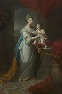 After her first pregnancy in 1764, she returned to Great Britain in the company of her husband to give birth to her second child.[7] Whilst in England, it was noted that the couple were cheered on by crowds every time they showed themselves in public. This reportedly exposed them to suspicion at court. During their visit, her sister-in-law Queen Charlotte apparently refused them some honours at court, such as military salutes. This attracted negative publicity toward the hosting royal couple.[8] During the negotiations thirty years later for the marriage of her daughter to the Prince of Wales, Augusta commented to the British negotiator, Lord Malmesbury, that Queen Charlotte disliked both her and her mother because of jealousy dating from the visit of 1764.[9]