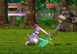 Combat—which uses a beat 'em up-style battle system—is divided into normal battles triggered by random encounters while navigating the roads and dungeon environments, and boss battles tied to story events.[2][4] While many normal battles are against a single enemy, sometimes multiple enemies appear in a single battle.[6] The player attacks using a single button, creating combination attacks depending on both the number of button presses and other actions such as jumping and dodging.[5][6] Each character has a main weapon and subweapons which can be thrown at enemies from a distance, and a shield which can be raised to block attacks.[3][7] All combat actions are tied to the Power gauge; every action consumes Power, with full depletion leaving the character vulnerable to attack. Standing idle or walking allows the Power gauge to replenish.[6][8]