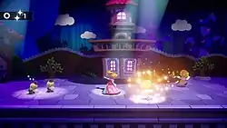 The player controls Princess Peach and has the ability to interact with objects and characters with the help of a sentient ribbon named Stella. By standing on a circular platform, Peach will gain special abilities to fit each play's setting.[3] Peach's transformations include Swordfighter Peach, Patissiere Peach, Ninja Peach, Cowgirl Peach, Figure Skater Peach, Detective Peach, Dashing Thief Peach, Mighty Peach, Mermaid Peach, and Kung Fu Peach, each with unique abilities.[4][5][6] Peach's health is measured through five hearts, but an additional three hearts can be granted for easier difficulty by equipping the optional Heart Charm power-up. It is also possible to unlock skins (called "Ribbons") for Peach and Stella by rescuing a Theet named Ribboner in each of the game's levels, playing a "Rehearsal" challenge, or using Sparkle Gems, which act as the game's currency.[7]