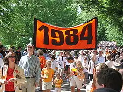 The P-rade then proceeds with members of each class from oldest to youngest, accompanied by spouses, children, family members, and even pets. Alumni of the Graduate School normally take the place of the 25th reunion in the sequence. In 2000 and 2001, to celebrate the centennial of the Graduate College, the Graduate School alumni marched immediately behind the 25th Reunion class. Each year, the University president honors the oldest returning alumnus by presenting him with a silver cane donated by the class of 1923. The bearer of that cane from 2002 to 2005 was Leonard Ernst '25, and in 2001 and from 2006 to 2012, the bearer was fellow '25 graduate Malcolm Warnock, who was 107 at his final Reunion appearance in 2012.[2] Ernst, Warnock, and most older alumni are typically chauffeured along the parade route by golf carts, but in 2001, the then-96-year-old Warnock impressed everyone by walking the last segment of the P-rade, waving his cane toward an appreciative crowd. In 2016, cane recipient Joseph Schein '37 (who has since received the cane 6 more times), walked the entire route with the cane at age 101.[3][4] In 2023, at age 108, Schein once again led the procession (this time via golf cart), receiving the cane as the oldest alumnus in Princeton's history.[5]
