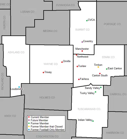 On July 1, 2020 the Canton Local School Board voted unanimously to join the Principals Athletic Conference. Canton South left the Eastern Buckeye Conference and joined the PAC-7 in August 2022. In 2022, Loudonville stepped down as a football only member and joined the Knox Morrow Athletic Conference.[10]