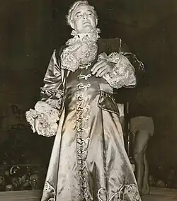 Gorgeous George, who performed throughout the 1940s and 1950s, was the first wrestler whose entrance into the arena was accompanied by a theme song played over the arena's loudspeakers,[33] his being Pomp and Circumstance. He also wore a costume—a robe and hairnet, which he removed after getting in the ring—and had a pre-match ritual where his "butler" would spray the ring with perfume. In the 1980s, Vince McMahon made entrance songs, costumes, and rituals standard for his star wrestlers; for instance, McMahon's top star, Hulk Hogan, would entertain the audience by tearing his shirt off before each match.[45]