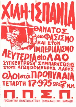 With the fall of the Junta OMLE developed two other mass organizations alongside PPSP, the Progressive Workers Unionist Camp (PESP) and the Progressive Students Unionist Camp (PMSP, for secondary students).[1][4] Later PPSP became the student wing of the Communist Party of Greece (Marxist-Leninist) (KKE(m-l)).[5][6]