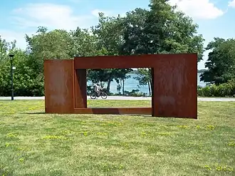 In 2009, the sculpture Continuum 2009 (à la mémoire de Pierre Perrault) was installed in the park. It is a three-element abstract artwork made of weathering steel. The sculpture was created by Roland Poulin, in tribute to the filmmaker Pierre Perrault. Three elements form a series of vertical and horizontal planes that frame an empty space. People can enter the artwork by walking through its frame. [3]