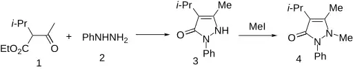 Ethyl 2-isopropylacetoacetate (1) and phenylhydrazine (2) are combined to form the pyrazolone ring in the intermediate (3), which is alkylated with methyl iodide to yield propyphenazone.[8][9]