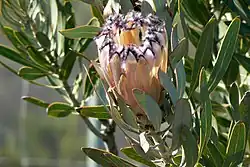 Protea laurifolia, also known as the grey-leaf sugarbush,[3][5][6] is a shrub from South Africa.[6][7] It is native to the Cape Provinces of South Africa.[8]