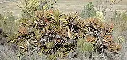 Potential wildfires destroy the adult plants, but the seeds can survive such events, being safely stored in a cap. The seeds are eventually dispersed by means of the wind. Pollination occurs through the action of birds. The plant grows on dry slopes in sandstone-derived soils, and is found at altitudes of 450 to 1,400 metres.[6]