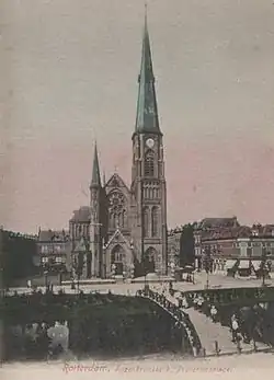 The church was built between 1898 and 1899[2] by the architectural firm of Albert Margry and Joseph Snickers.[3] Margry designed a three-aisled church in neo-Gothic style, with a tower next to the facade. Provenierskerk was consecrated on May 8, 1899, by the Bishop of Haarlem. The first year it had no church bells, which were only installed in 1910.[1] In 1916 the church received an organ. On the side walls of the church was a special Stations of the Cross, which was created by the Delft Factory The Royal Delft. A marble communion rail was placed in the church in 1914. The church was served by the Fathers Dominicans.