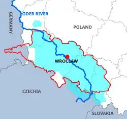 1. ^ After World War I Poland received a small part of historical Lower Silesia, with majority ethnic Polish population as of year 1918. That area included parts of counties Syców (German: Polnisch Wartenberg), Namysłów, Góra and Milicz. In total around 526 square kilometers with around 30 thousand[6][3] inhabitants, including the city of Rychtal. Too small to form its own voivodeship, the area was incorporated to Poznań Voivodeship (former Province of Posen).