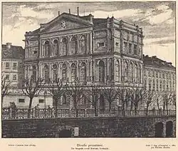 Before the early 1860s almost all cultural institutions in Prague, including theatre and opera, were in Austrian hands. Bohemia was a province of the Habsburg Empire, and under that regime's absolutist rule most aspects of Czech culture and national life had been discouraged or suppressed.[1] Absolutism was formally abolished by a decree of the Emperor Franz Josef on 20 October 1860, which led to a Czech cultural revival.[2] The Bohemian Diet (parliament) had acquired a site in Prague on the banks of the Vltava, and in 1861 announced a public subscription, which raised a sum of 106,000 florins.[2] This covered the costs of building a small 800-seat theatre,[3] which would act as a home for production of Czech drama and opera while longer-term plans for a permanent National Theatre could be implemented.[4] The Provisional Theatre opened on 18 November 1862, with a performance of Vítězslav Hálek's tragic drama King Vukašín.[5] Since there was at the time no Czech opera deemed suitable, the first opera performed at the theatre, on 20 November 1862, was Cherubini's Les deux journées.[5] For the first year or so of its life, the Provisional Theatre alternated opera with straight plays on a daily basis, but from the start of 1864 opera performances were given daily.[5]