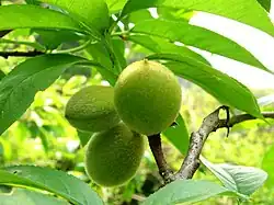- Leaves: Dark green,[4] glabrous leaves are lanceolate-narrow ovate in shape, ranging in length from 5–12 cm (2–5 in).[3] Leaf point is long and slender, tapering to a point;[3][4] leaf margins finely toothed.[3][4] Petioles are glandular.[3]