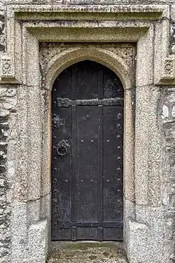 It is constructed from Plymouth limestone rubble using relieving arches with Dartmoor granite hooded and ogee-framed Tudor dressings to glazed window openings, dry Devon slate roofs and two original lateral chimney stacks. The front has a distinctive and fine granite transomed bay window arrangement over a decorated and hooded doorway.[2]