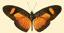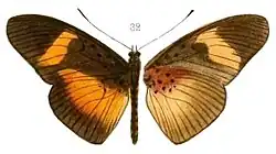 - ab. epigea Btlr. The subapical band and the broad hindmarginal spot of the forewing are light orange-yellow as in the hindwing the same, the upperside only with a dark marginal band 3–4 mm. in breadth. Among the type-form.